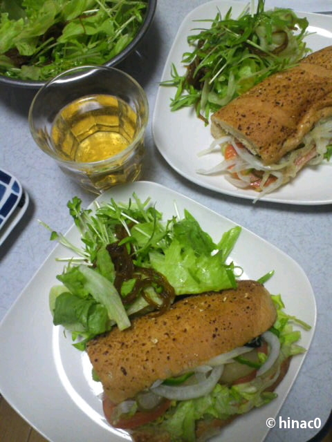 サブロウキャンペーンにのっかって、特サブ(野菜全部増し)をテイクアウト。いろいろと誤解があり、奥は乃木坂店の320円の特サブ、手前は六本木店の290円の特サブです。長旅を経てぐったり気味(苦笑)