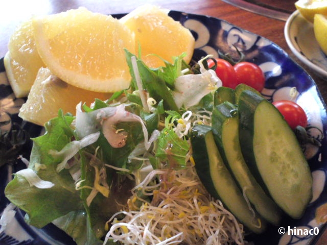レタスと貝割れのサラダはもずくがのっかってます。市販の玉ねぎドレッシングがぴったりでした。