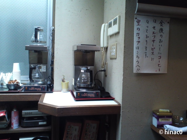 コーヒー無料とは聞いていたものの前回勝手が分からなかった赤べこ。なんとコーヒーは、食後に二階席でいただけました。階段を昇ったら、座敷の傍らにコーヒーメーカー。なんというサラリーマンの憩の場!