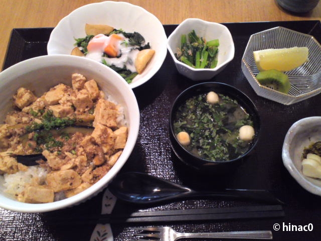 今週のワンコインメニュー!家庭的な麻婆豆腐に茄子がトッピングされたような麻婆茄子。サラダのドレッシング、今度から無しにしてもらおうかな…卓上のゆかりの方が合いそう。