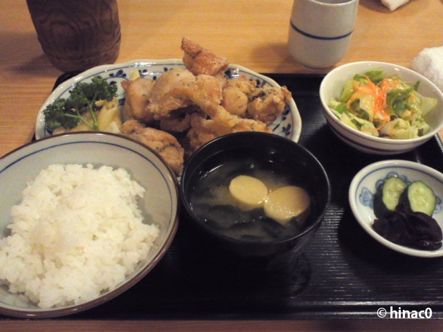 10分ほどしてやってきた定食は、案の定ご飯少なめ、茶碗一杯分ってところ。しかし、皿に並んでいる唐揚げがデカイ!バランス的にはご飯大盛りじゃないと足りないぐらいですが、唐揚げでお腹いっぱいになったので、最初の量で大丈夫でした。