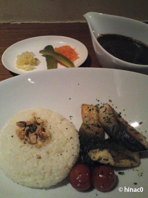 ピクルスの小皿が来た後に、カレーがやってきました。ここのカレーは地中海料理×欧風カレーというもので、未知の世界。鯖カレーなんてなかなか見ないと思って頼みました。インド系の魚カレーをイメージしていましたが、パリッとソテーされた鯖がご飯に添えられていて、カレーは陶器のカレーポットで。鯖だけいただくと、塩が効いたおいしいソテー…で、カレーをかけたら臭みが消えました。カレーは形に残る具はなく、甘さととろみの強いカレーでした。中辛でもそんなに辛くありませんでしたが、スパイスで体があったまって、うっすら汗をかきました。