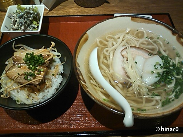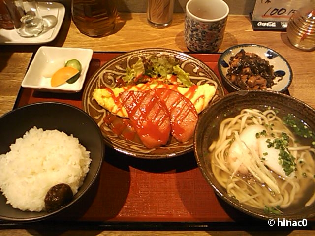 お酒もありますが基本は定食屋で、お酒を頼むとチャージ料がかかるようです。定食はAが1500円、Bが1200円、Cが1000円。800円で焼きそばやチャーハンもあります。二人でBとCをオーダーしました。ポーク卵の方がC、沖縄そばにラフテー丼の方がB。小鉢もちゃんと沖縄の料理です。ラフテーはとろとろになるほど煮込まれています。素朴な沖縄そばに卓上のこーれーぐーすを垂らすと、風味がかわってまたおいしい。ご飯に添えられた油味噌も嬉しいサービスです。