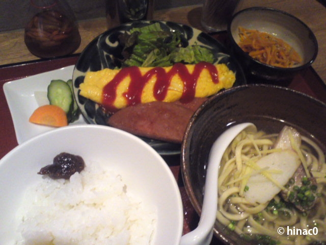 店頭には「A定食、B定食、C定食」の黒板だけありましたが、メニューには沖縄そばや焼きそば、単品の料理やお酒もありました。時間も遅くなっちゃったけど、今日は看板メニューのC定食で。沖縄そばのハーフとご飯、ポーク卵、人参シリシリ、おしんこのセットです。いたってシンプルな沖縄の家庭料理って感じです。ご飯には肉味噌がちょこんとのっているのもイイ。そばじゃなくてご飯大盛りにしてもいいと思うんだけど…馴染みになったら言ってみようかと思います。