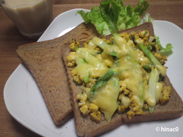 アスパラはスライス、クレソンは刻んでさっと茹でて水気をきっておきます。つぶしたゆで卵とクレソンを混ぜて塩で味付け。パンに乗せてマヨネーズとチーズをかけて焼きます。レタスともう一枚のトーストでサンドしてもよろしいかと。