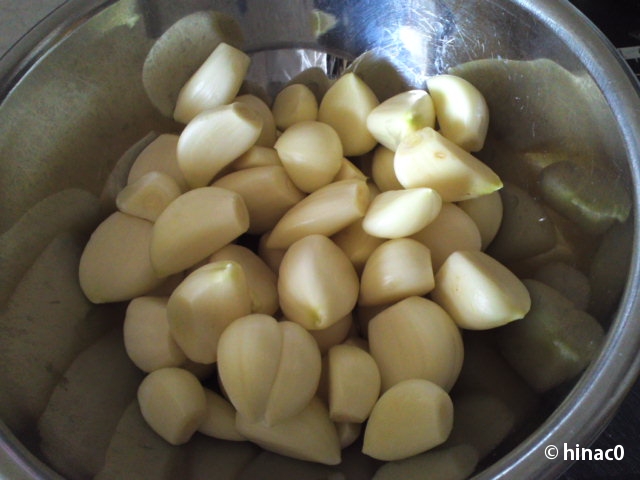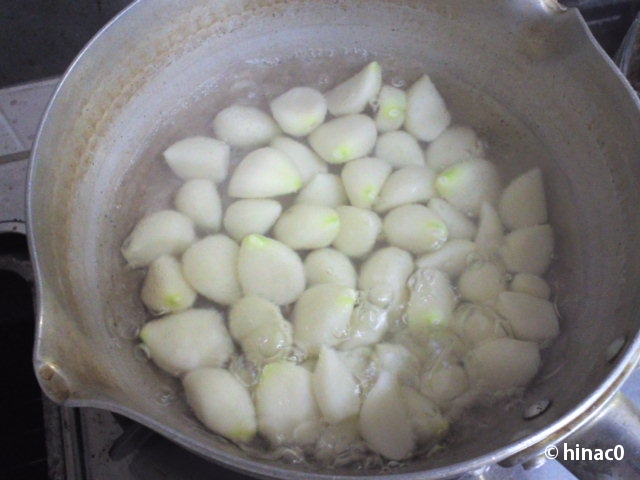 先日、両親が車でやってきたときに、叔母さんに頼まれたのだといって、ニンニクの山を持ってきました。そのなかから二袋もらったので、AZUKIさんから教わったボイルドガーリックを作ってみました。