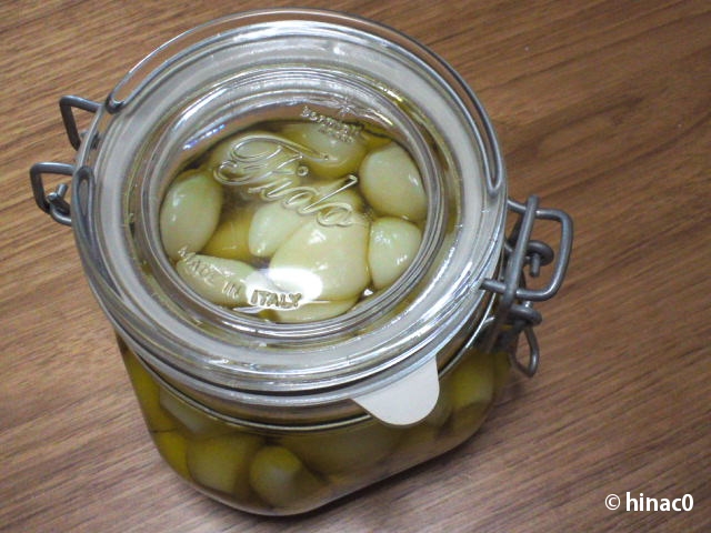 6 煮沸消毒した瓶にニンニクを詰めて、オリーブオイルをタパタパ注ぐ