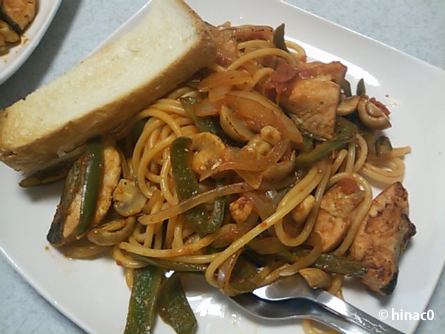 冷凍庫の中のものも合わせてあるものを組み合わせたので、ベストな材料ではないです。なんとなく鮭の味付けにハーブソルトを使ったら、いいアクセントになりました。濃いめにしたつもりがパスタを入れたらソースが足らずケチャップ追加、とバタバタでしたが、結果オーライ。一枚だけ残っていた食パンをトーストにして添えて出来上がり。
