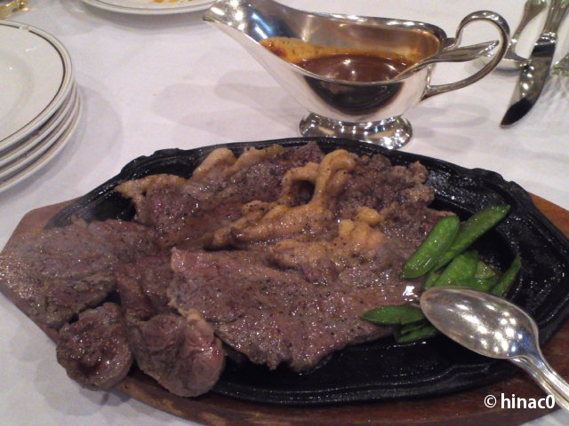 ビールに合うコースで、牛肉のステーキが食べ放題。福島産とも国産ともなかったので、オージービーフかなんかかもしれません。どちらにしてもこの騒ぎで、牛肉の値崩れ値乱れは激しそうです。前菜三種、胡椒の効いたソーセージやブルーミングオニオンフライ、鮭(鱒っぽかった)のガーリックソテー、どれもビールが進むメニュー。が、彼一家の男性陣は飲まないので、義母さんと二人でいただきました(苦笑)