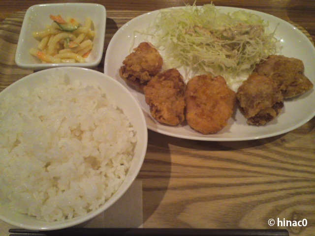 ほどよい大きさの唐揚げは5個、マカロニサラダとキャベツサラダ付きです。唐揚げは衣が硬めで好みが分かれるところかな。500円なりな感じがしました。味噌汁かスープが付くもんだと思っていたら、別というかメニューにないような感じで、少し拍子抜けでした。でもご飯は大盛りOK。今夜も食べ過ぎです。