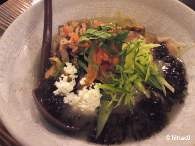 冷やし塩の具は、チャーシュー、生ハム、トマト、カッテージチーズ、胡瓜、しそ、メンマ、焦がしネギ…?!スープはかなりとろみがあって、よく冷えてます。こしの強い麺を冷やしているので、噛みごたえは冷麺?チーズとトマトでイタリアン?でもメンマ??!と、とても楽しいラーメンです。いや、ラーメン食べた気になりません(笑) でも、おいしいので、冷たい麺が食べたい時に、是非お試しください。