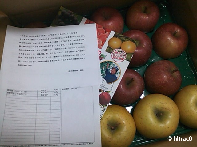 先日彼が帰省した際、実家ではここのリンゴを食べていたそうで、線量も検出されていないというのでねだったのだそうです。私は正規ルートで出回っているものは疑っていませんので、福島産も大歓迎。果物、めちゃくちゃおいしいですし!