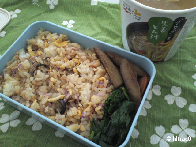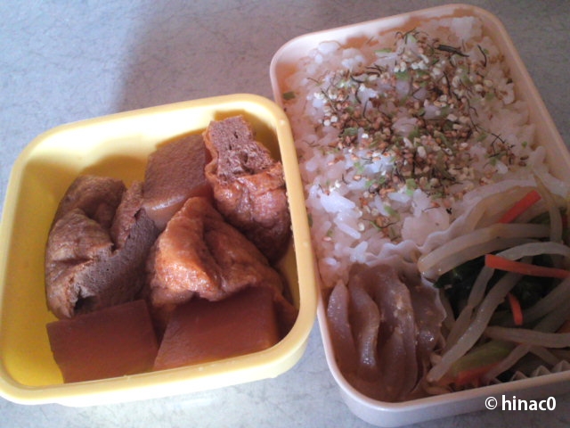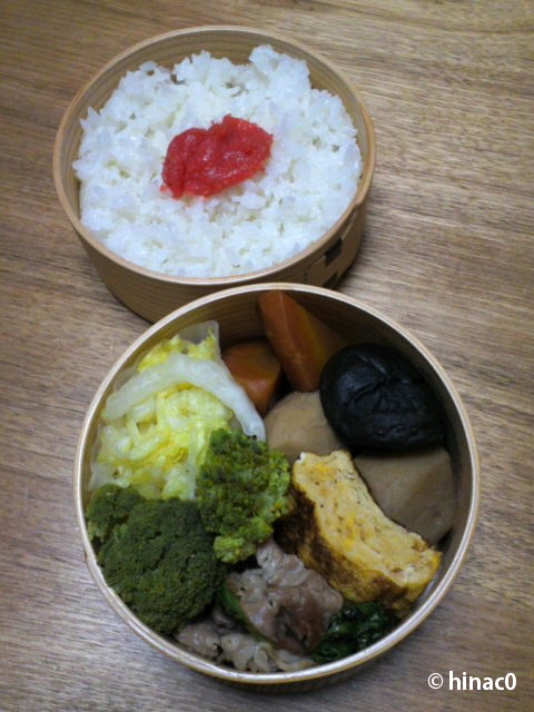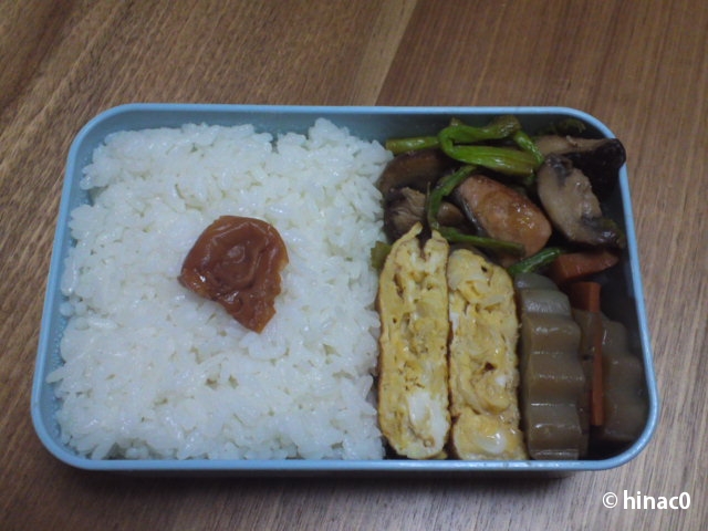 バター炒めの鮭は二切れほどだけにしたので、メインは玉子焼きです。バター醤油は香ばしくておいしかったです。玉子焼きは薄味ながら無難な仕上がりでしたが、問題はこんにゃく。「牛蒡とこんにゃくの組み合わせは要注意」ということを忘れて、青緑に変色させてしまいました。一緒に扱う時は、下茹でが必要でしたね。よく煮込んだのに染み込む調味料が足りなくて、色だけという感じの煮物になってしまいました。反省。ご飯にのせた梅干しはしんどー家からのいただきものです。すっぱめ、うまーです。