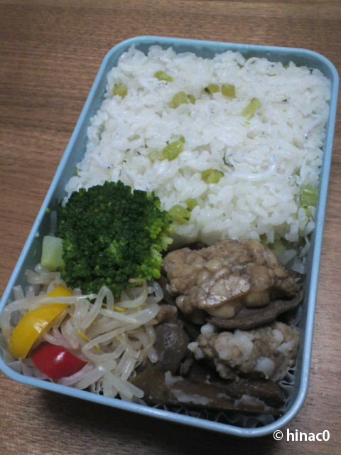 大根の葉っぱご飯にはしらすも混ぜて、ブロッコリーと、もやしの塩コショウ和えと。