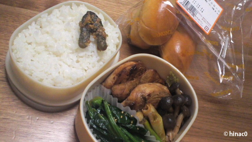 おこわは実は、前夜に作った失敗作です。どれだけ蒸かしても芯が残ってしまい、最後は一旦ラップにくるみ、レンジで蒸かしてみました。肉を入れなかったのでもち米だけでは重たいかと思い、冷蔵庫から米を足したのが原因かと。温度が均一でなく、給水も不十分だったのでしょう。まぁ、食べられる程度にはなりましたが、張り切って入れた銀杏がカピカピになってしまいました。
