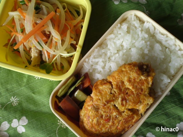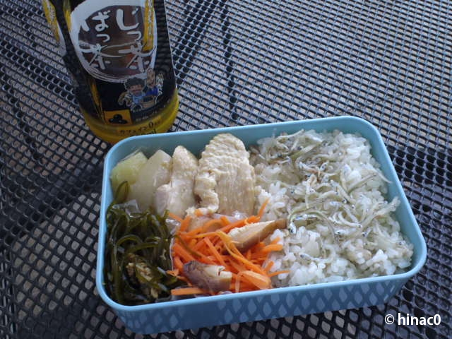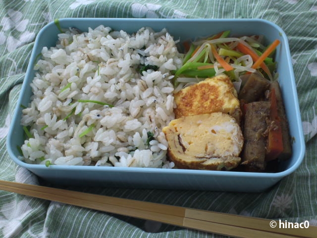 この和え物は、夏場はお弁当には傷みそうな予感。彩りはよいです。おかか煮は牛蒡と人参を下茹でしてから、被るくらいの水と調味料を入れて煮詰め、鰹節をまとわせました。玉子焼きの白だしは、使わないとなくならないので渋々。いつもは出汁入れずにやいちゃいます。じゃこと、さっと茹でた三つ葉を混ぜたご飯はさっぱりと香りもよくてなかなかおいしかったです。胡麻も合いそうでしたが、あえてはずしました。なくても充分でしたよ。