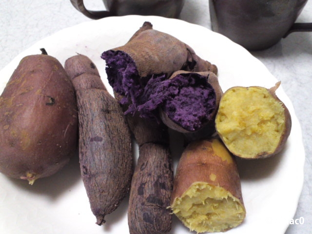 蒸籠で蒸しました。紫芋はパサパサと筋っぽい芋でしたが、甘過ぎるほどの安納芋との対比がおもしろかったです。