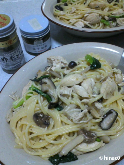 鶏ささみとたっぷりきのこの柚子ごしょうパスタ
