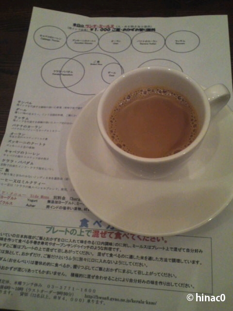 食後にはチャイを。今日もおいしい南インド料理ありがとうございました。