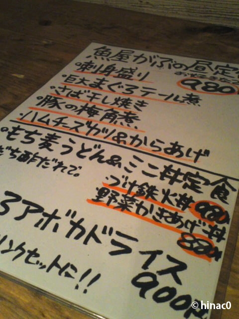 暑いですね。先日ここでアボカドマグロ丼を食べた友人が気に入ったらしく、再訪です。わさびが効いていて暑い日にはピッタリくる丼のようなのですが、どうも上に散らされたとびっこがそそらないのです(苦笑) ぐるなびのメニューを見ていると、鮪テールの煮付けや揚げ物なんかに目が行くのですが、先日伺ったときにはそんなメニューがなく…確認も兼ねていってきました。