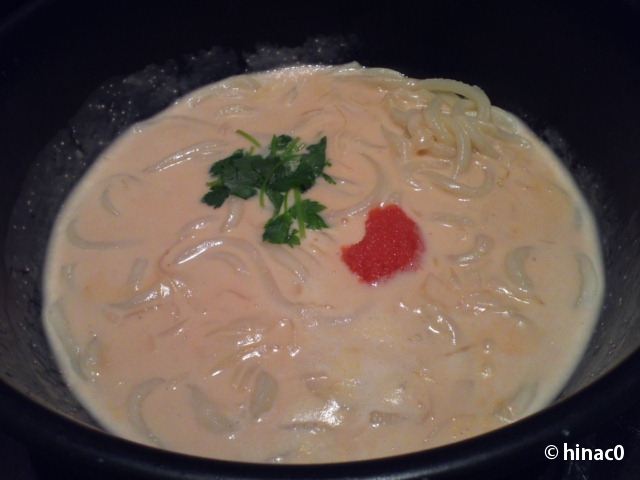 〆にいただいたうどん二種類は、夏メニューから鱧を使ったうどんと、定番メニューの明太子クリームうどん。二玉まで同じ値段なので、一つ半ずついただいて、四人で分けました。うどんはもちもちした感じで、トロミのあるスープによく絡みます。クリームうどんは出汁が効いていて、変わり種でも馴染みやすかったです。和風なのでパンにつけるには少し違うかもしれませんが、パンとワインが欲しい気分になりました。