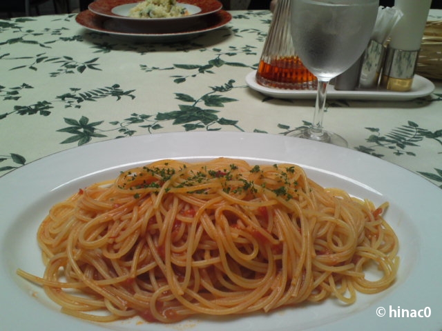 やってきたパスタはいたってシンプル。少し細めのパスタはアルデンテで、ピリ辛もちょうど。栄養の偏りが心配ですが、けちったのは私です(涙) そして、夕方にはお腹がすいてしまったのでありました。