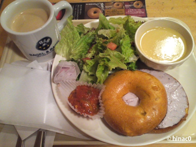 あとはキューバ料理のお店が、丼モノを700円台で出していましたが気分ではなく、時間もないので、ベーグル&ベーグルでランチにしました。マンゴーベーグルにブルーベリーのクリームチーズを塗ったのがメインで、サラダ、ラタトゥイユ、スープ、ドリンクと一口サイズのチーズケーキがつく充実のセットです。ベーグルは専門店なだけあって、もちもちしておいしいです。メインが甘系でしたが、サラダもついて、バランスは悪くない気分です。コーヒーもたっぷり。2時過ぎのランチには丁度よかったかもしれません。