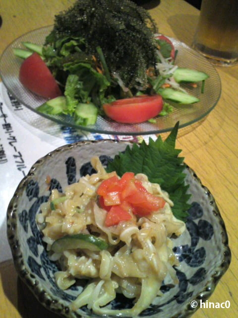 二時間半の飲み放題付で、お通し、海ぶどうサラダ、ミミガー、チャンプルー、唐揚げ、ラフテー、などなど、ボリュームもそこそこの本場のお料理が出てきて大満足。最初の二品だけカメラにおさめましたが、盛り上がるにつれ、話に夢中になってしまいました。