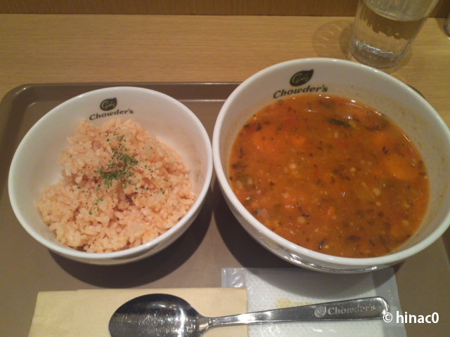 ガーデンベジタブルのラージサイズとトマトライス。ご飯を食べたい気分だったのですが、ライスは大盛りに出来ないんだそうです。そういうお店じゃないんでしょうけど、できてもよさそうなのに。。スープにはお豆や芋も入っているので、充分おなかいっぱいですけどね。食べ過ぎ注意ってことですな。