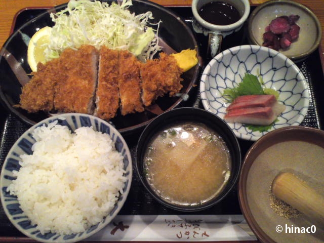 定番のロースカツ定食はお刺身付き。胡麻もついています。見た目はとてもよかったのですが、衣が厚めで肉から剥がれてしまいまったのが残念でした。おろしポン酢でいただく和風トンカツの方が、この衣は合ったと思います。ソースは酸味が強く、お店によっていろいろなんだなぁと、今更ながら感じました。