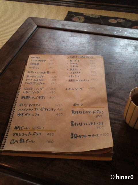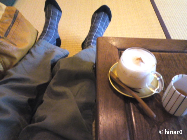 民家の二階を改造して作ったカフェで、靴を脱いで階段をあがると、畳敷の和室が二つ。ちゃぶ台があって、本棚には古い雑誌やマンガが置いてあります。足を伸ばしてくつろぐにはピッタリ!暑かったのにスパイスミルク紅茶なんて頼んで、早速まったりです。