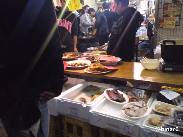横浜橋商店街は入り口手前から出店が並んで、昼間以上の大にぎわい。いや、昼とは比べ物にならないかも…人を掻き分けて目的地へ向かいます。辿り着いたのはなんと魚屋。奥で友人が、「遅いよー」と言いながら手招きしていました。「遅いから牡蠣なくなっちゃったよ」との話。大きなポリバケツには、刺身を盛っていたトレイや空き缶と一緒に牡蠣の殻が山積みになっていました。