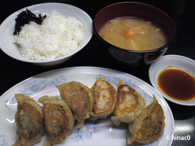 とはいえ雰囲気は男飯。余計はことは言わずに、餃子定食を注文。焼き餃子とご飯、豚汁のセットです。できあがりまでは壁のメニューを眺めながら過ごしました。水餃子の定食、ビール、持ち帰りの冷凍餃子もあるようです。今日はビール気分じゃなかったのでやめましたが、常連の女性のお客さんが、「いつもの」でビールを出してもらえていたのは羨ましかったです。
