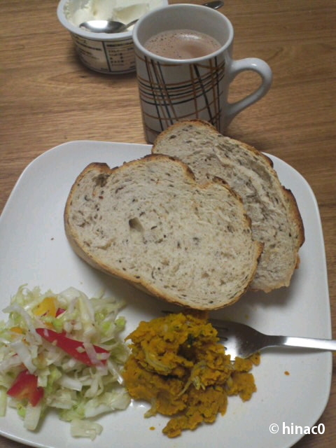付け合わせのサラダはキャベツとパプリカで作ったマスタード和えです。残り物の南瓜サラダと、カロリーオーバーなココアで。