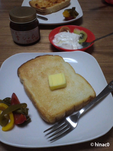 Milkyの食パンをトーストで。バターが合います。切れてるバター、1欠け10gは多いので、サービスでもらったパンの耳にもつけました。ヨーグルトにはキウイを刻んで、今朝もビタミン補給。風邪はだいぶよくなってきました。