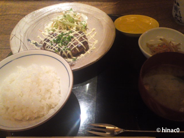 ハンバーグはわさびマヨネーズ味。ご飯半分おかわり頼んだら、普通の茶碗に一杯出てきました。食べ過ぎました…。