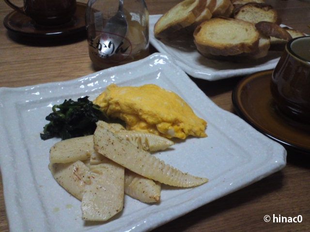 夕飯には物足りなかったので、家に帰って早速筍でおつまみを作ってみました。梅干しとおかかで和えた、さっぱりヘルシーなおつまみです。梅村のママからもらったぬか漬けと一緒にいただきました。旬の筍は香りがよく、とてもおいしかったです。