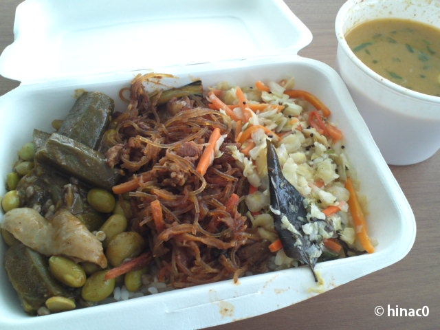13時前でしたが何人か並んでいて、常時6種類あるおかずも2つがなくなっていました。アジア各国のお料理を扱っているそうで、タイ、中国、インド、韓国、日本など、いろいろです。