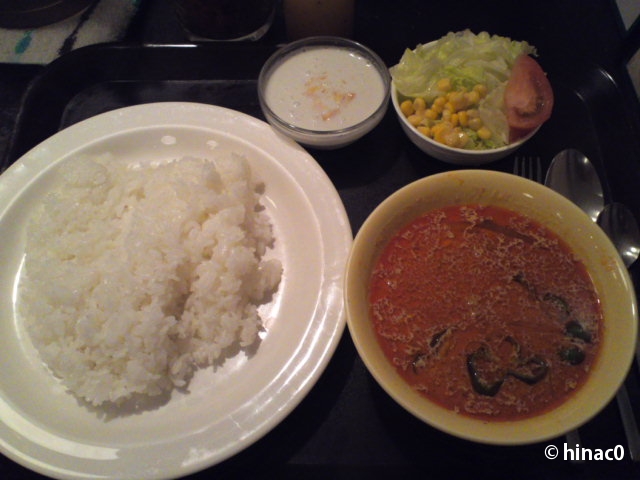 赤いカレーはココナッツが効いたさらっとしたカレーで、辛さもまずまず。具は鶏肉とピーマンくらいですが、セットで700円ちょいなので妥当なとこです。ケララ風のカレーやカレーピラフと、同じカレーでもタイプが違うメニューがあるので、近場にあったら日常使いしたいお店のひとつです。